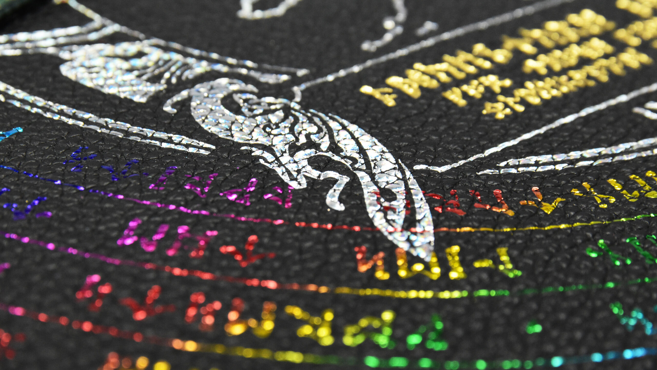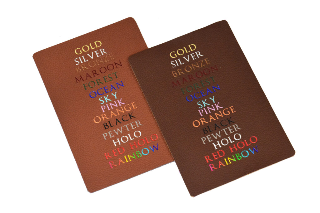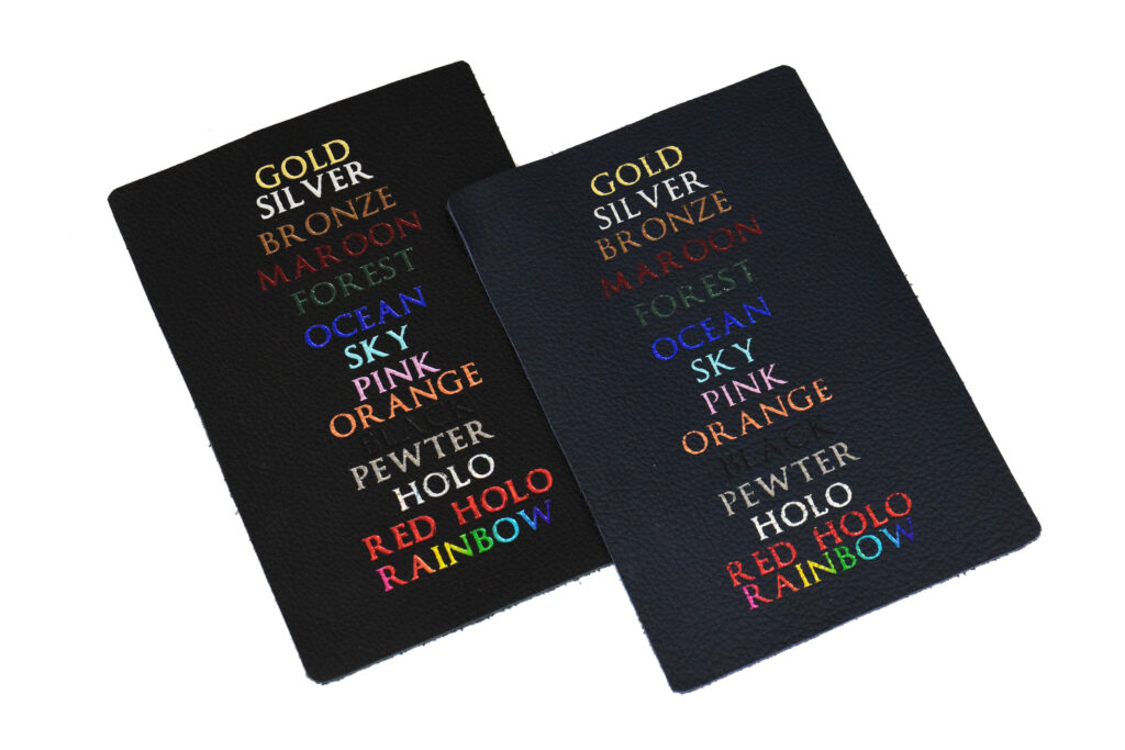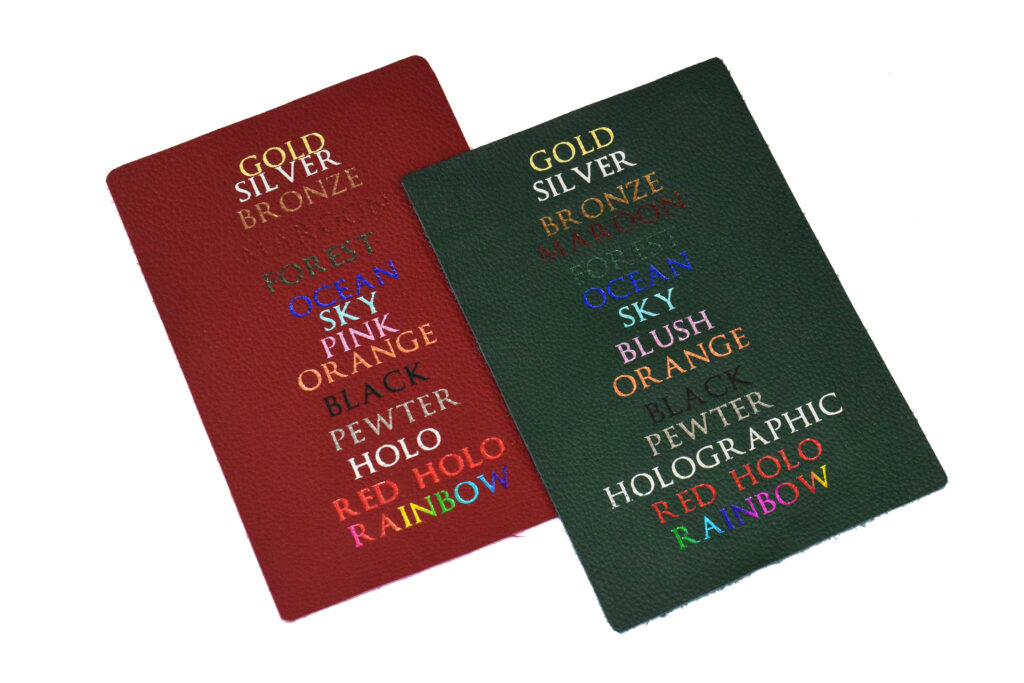 Gold, Green, and Red Dragonscale leathersFoil pressing can capture small details, but there are limits to what will render well on the pebble-grain leather surface.Holographic foil looks basically silver, until the light strikes it from the right angle.Detail of amethyst and crimson leathers.Let us know if you want your rainbow foil rotated vertically or horizontallyThis scroll sports onyx leather with gold and rainbow foil.