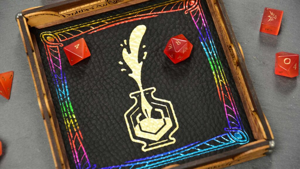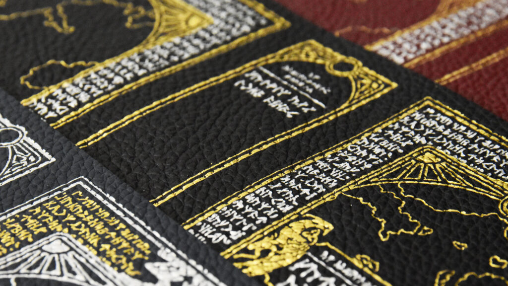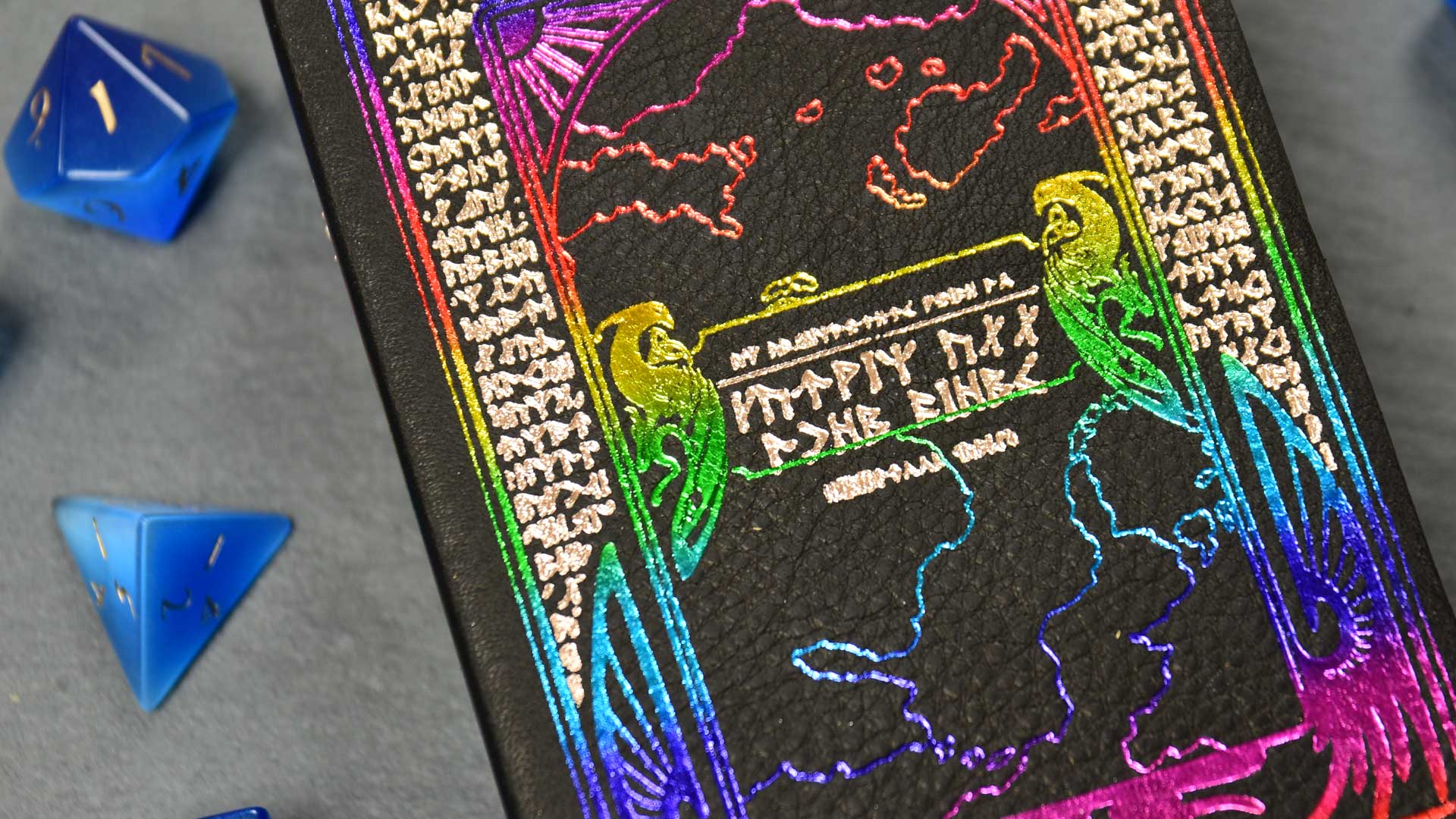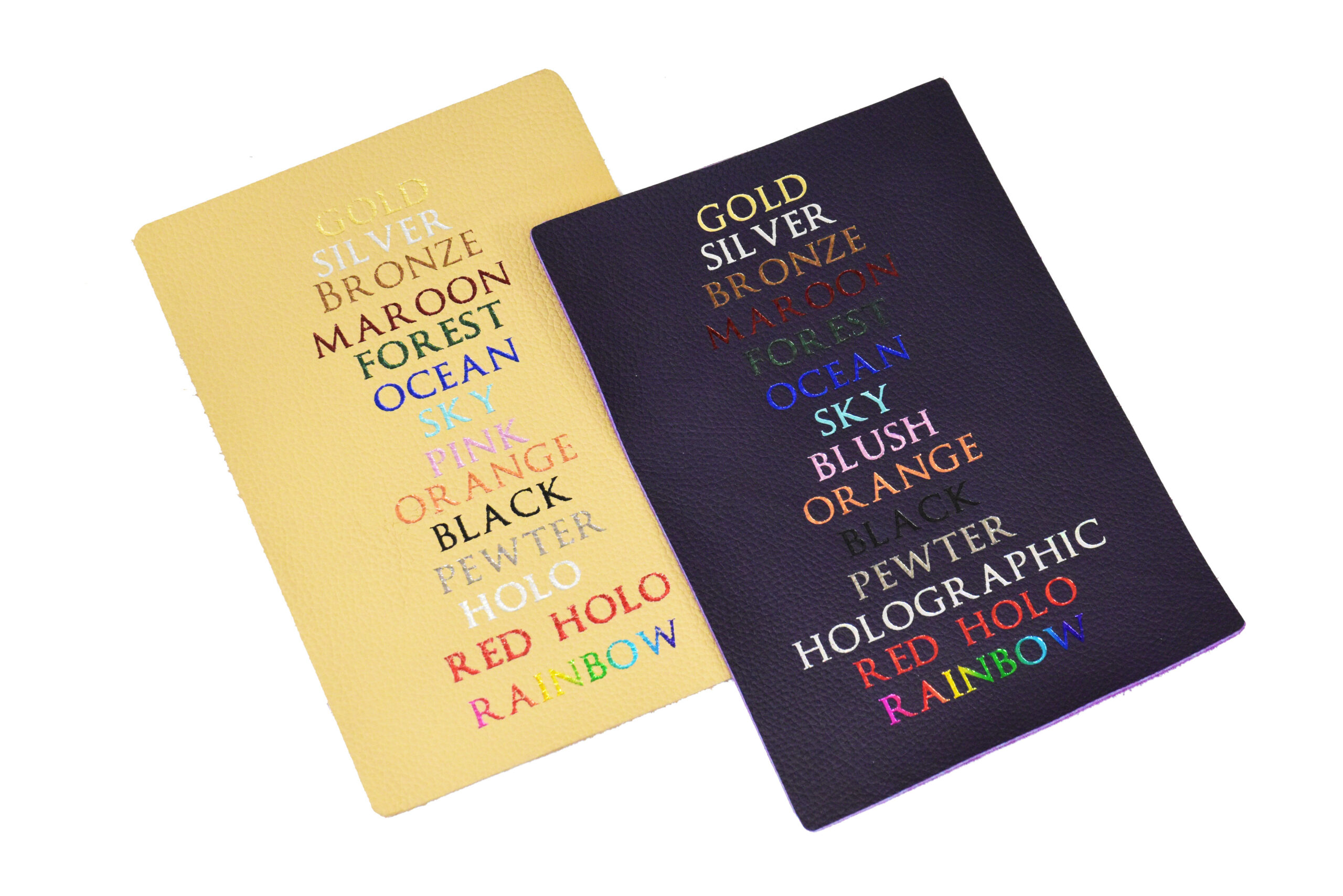 Gold, Green, and Red Dragonscale leathersFoil pressing can capture small details, but there are limits to what will render well on the pebble-grain leather surface.Holographic foil looks basically silver, until the light strikes it from the right angle.Detail of amethyst and crimson leathers.Let us know if you want your rainbow foil rotated vertically or horizontallyThis scroll sports onyx leather with gold and rainbow foil.