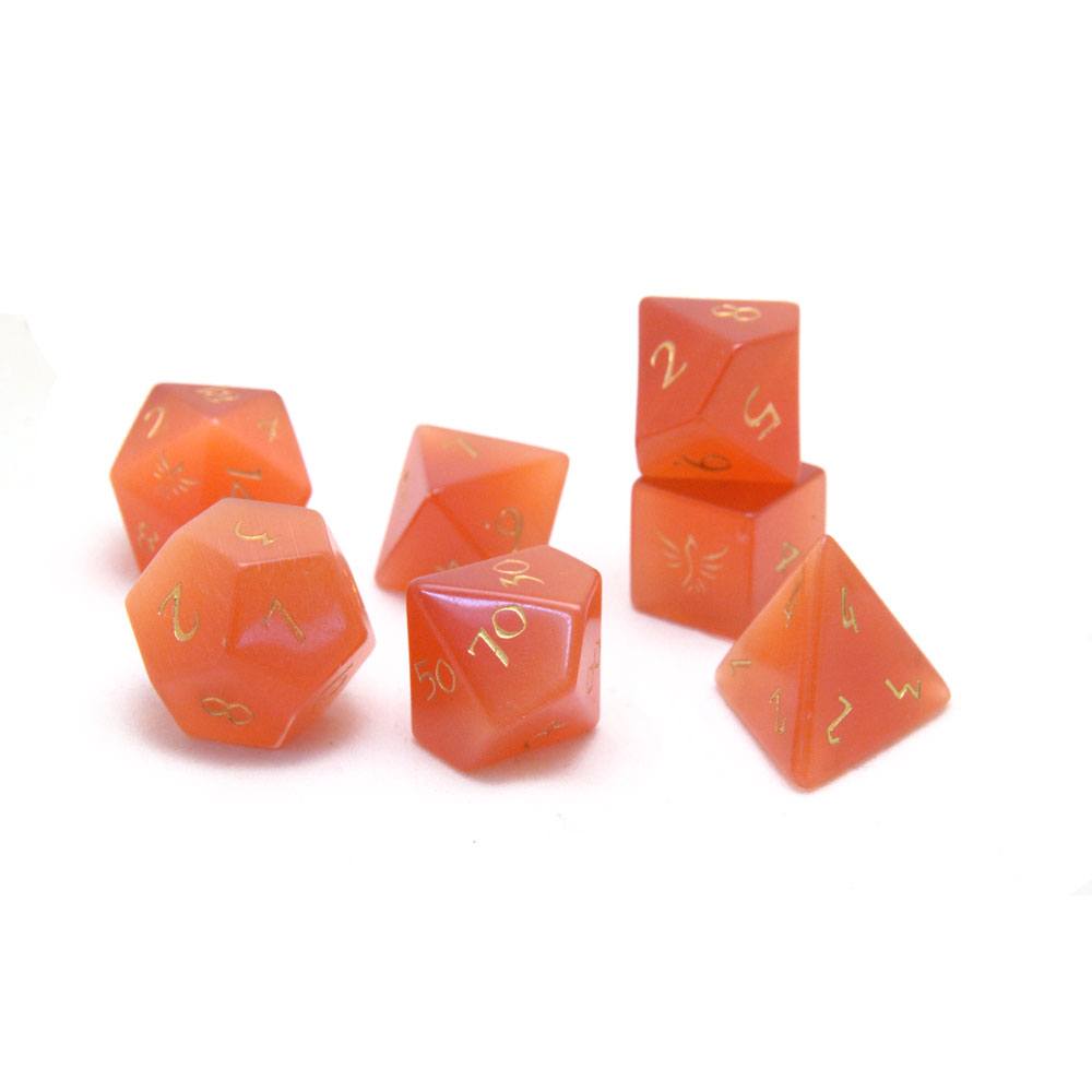 Cat’s Eye Phoenix Dice are hand-cut, polished and engraved out of fiber-optic glass to deliver flash and style to your every roll. These red-orange polyhedral dice features engraved and (gold) painted numerals for the look and luxury you deserve.