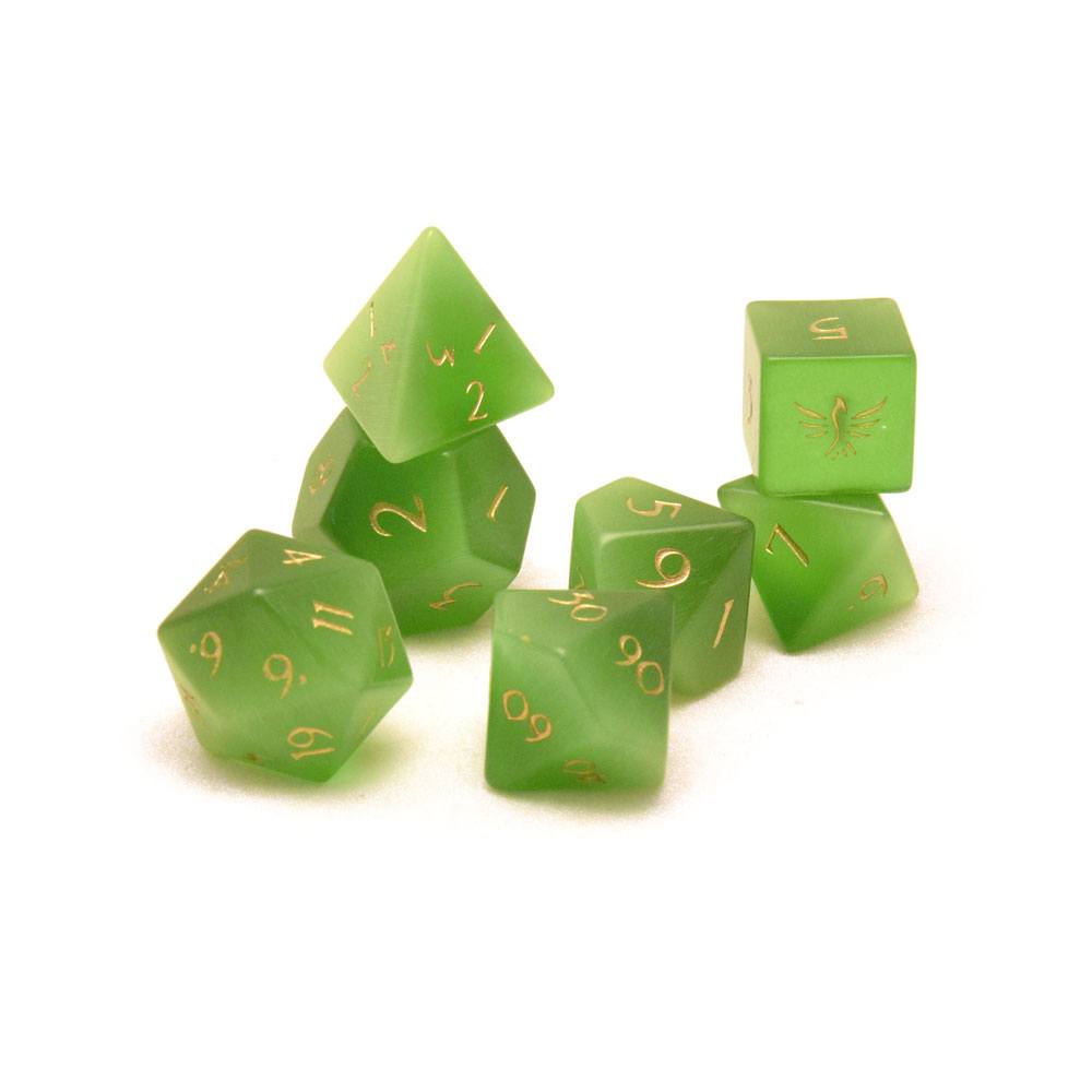 Cat’s Eye Phoenix Dice are hand-cut, polished and engraved out of fiber-optic glass to deliver flash and style to your every roll. These green polyhedral dice features engraved and (gold) painted numerals for the look and luxury you deserve.