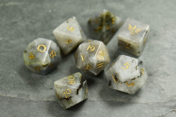 Labradorite is a grayish stone that sometimes exhibits an iridescent sheen caused by microscopic planes within the crystal structure. This elegant stone cuts and polishes beautifully and makes dice that are the perfect companion dice for your Hex Chest or Spellbook dice box. Designed for Dungeons and Dragons, or other tabletop RPGs, a set of our signature phoenix labradorite polyhedral dice includes one of each: D20, D12, D100, D10, D8, D6 and D4. These handsome labradorite DnD dice are a great addition to any dice collection and feature our Phoenix Font engraved numerals with our Elder Phoenix on the 6-side of the D6.