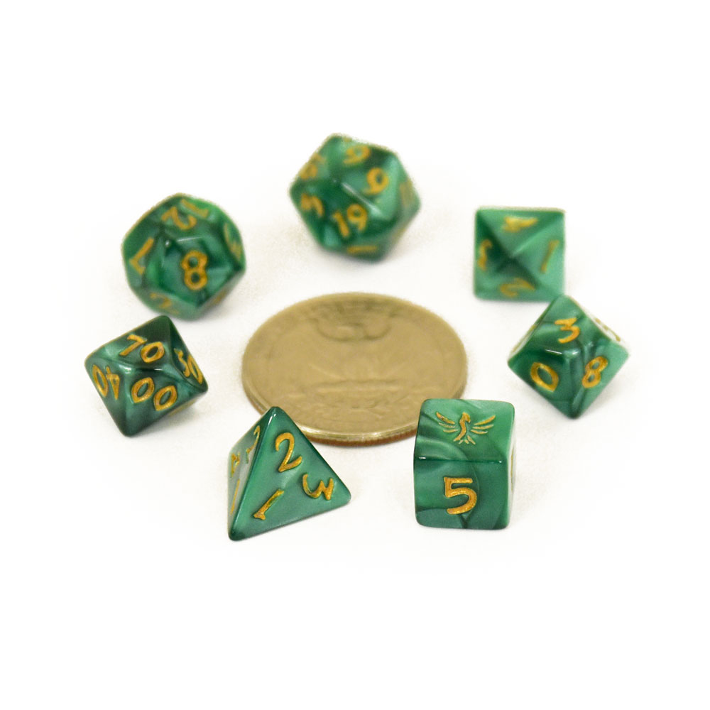 Set of 7 polyhedral dice: D20, D12, D100, D10, D8, D6, and D4.